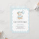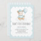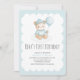 This design features a preppy bear birthday themed "Bear'y First Birthday" with a cute teddy bear in pastel blue baby outfit, a balloon in its hand sitting on a cute cloud, scalloped borders and striped blue and white backside. Perfect for a baby boy's first birthday party. This product can be easily personalized.
