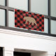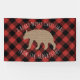A banner featuring an illustration of a burlap bear silhouette over a red and black lumberjack buffalo plaid check background. Text says, "A BEARY MERRY CHRISTMAS" Personalize with your name.