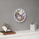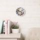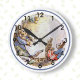 Personnalisez cette horloge murale ronde imprimée avec une jolie image d'illustration Beatrix Potter d'une famille de lapins. Créé en orange pêche douce, bleu et marron avec un accent de bordure en cercle bleu. Belle crèche ou accent chambre enfant, coordonnées avec lampes, coussins et autres éléments de décoration de pépinière à www.zazzle.com/kidsunique