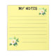 Un bloc-notes jaune clair avec des lignes verticales noires et une illustration montrant une belle fleur en aquarelle dans le coin supérieur droit et inférieur gauche.