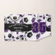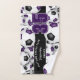 Cette serviette esprit d'équipe pour les joueurs de football présente des boules de football de tailles variées avec des couleurs violettes et noires d'équipe tournées partout sur un arrière - plan blanc et un numéro de maillot proéminent en violet surplombant une bande de couleur noire pleine longueur, sur laquelle vous pouvez également customiser le nom de l'athlète, le nom de l'équipe et le nom de la mascotte en blanc - par katz_d_d_zynes