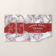 Cette serviette cool pour les joueurs de baseball ou de softball dispose de tailles variées, réalistes, blanches de baseball propres tournées de chaque côté sur un arrière - plan blanc et numéro de maillot proéminent en rouge sur une bande de couleur rouge audacieuse et pleine longueur, sur laquelle vous pouvez également personnaliser le nom de l'athlète, nom de l'équipe et nom de la mascotte - par katz_d_zynes