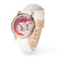 An elegant rose gold watch with a beautiful red, blue and pink liquified abstract design. This pretty watch comes with an elegant white leather wristband. The watch face has a text message and a photo. Text and photos are customizable, and can be easily personalized to fit your needs. This unique and beautiful watch is the best gift for your wife, girlfriend and mom. Great gift for birthday, wedding, anniversary, holiday, Valentine’s Day, Mother’s Day , and for yourself!