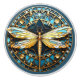 Gorgeous Art Deco image of a Dragonfly with stained glass effect wings, against a beautiful, intricately detailed Art Deco tile. Pretty shades of blue, turquoise, and gold.