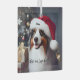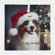 This wonderful Christmas design shows a sweet Australian Shepherd wearing a red Santa hat.