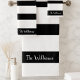 Modern and elegant, personalize a lovely bathroom towel set. The design features a beautiful black and white striped theme with your text included on the lower right hand corner of each item. This set includes a wash cloth, hand towel, and bath towel which can be purchased together or separately.