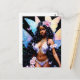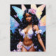 This fantasy postcard features a portrait painting of a pretty, dark brown-skinned fairy with very long, wavy hair wearing a purple outfit in a magical night forest with butterflies and flowers. A vibrant, hyper-feminine floral artwork of an ethereal beauty with butterfly wings.