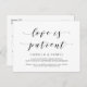 This is the modern minimal simple clean design themed, in Black font, Wedding party invitation Rescheduled (postponed / postponement) postcard (love is patient) . It is the perfect and elegant way to make the reschedule announcement to your friends and family.