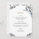 Simple and pretty blue grey foliage border wedding menu with classic typography. Please view this botanical wedding collection for coordinating invitations and accessories.