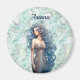 A beautiful mermaid with long flowing blue hair against a background of teal with a seashell and frond pattern.