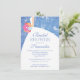 Pretty modern bride bridal shower invitation featuring a bride in a white bridal gown holding a bouquet of pink and blue flowers set on a blue floral flowers background.
