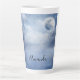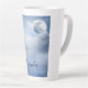 A latte mug with a magical fantasy sky with fluffy blue clouds and a big beautiful moon. 2 white swans flying off together.