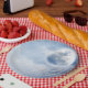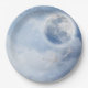 Paper plates with a magical fantasy sky with fluffy blue clouds and a big beautiful moon. 2 white swans flying off together.