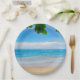 Paper plates with a landscape photograph of a tropical beach. Azure water and blue sky with gentle waves lapping at the shore with some clouds in the distance.