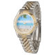A watch with a landscape photograph of a tropical beach. Warm sand, azure water and blue sky with tropical leaves along the top.