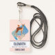 Name badge with a pretty brown deer with a white spotted back. A little bird sitting on the deer's back. A fancy floral bouquet with watercolor roses and light olive green leaves under the deer's feet. A blue watercolor rectangle behind the image. Peach coloured background.