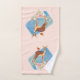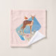 Towels with a pretty brown deer with a white spotted back. A little bird sitting on the deer's back. A fancy floral bouquet with watercolor roses and light olive green leaves under the deer's feet. A blue watercolor rectangle behind the image. Innocent and sweet design with rustic elegance. Peach coloured background.