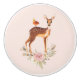 A ceramic knob with a beautiful brown doe with white spots on her fur. A cute bird sitting on the deer's back. An elegant flower arrangement composed of watercolor roses and light green leaves beneath her feet. peach coloured background.