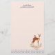Stationery paper with a beautiful brown doe with white spots on her fur. A cute bird sitting on the deer's back. An elegant flower arrangement composed of watercolor roses and light green leaves beneath her feet.  A blue polka dot border with a peach coloured background. Darling and adorable design. Personalize with a name.