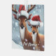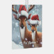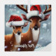 This design features a buck and a doe who are wearing Santa hats in the snow.