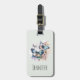 A luggage tag with a trio of butterflies fluttering among some pretty flowers. Blue pink and green colour scheme.