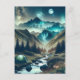 A beautiful ai camping illustration of a tent set up next to stream with a mountain background and the Northern Lights and full moon in the sky.