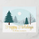 A beautiful winter landscape with teal green pine trees and snow covered ground on personalized gold foil business holiday postcards. Customize this company Happy Holidays postcard with your own corporate message on the back in elegant cursive script.