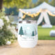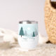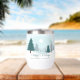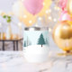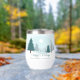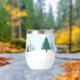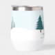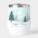 A beautiful winter landscape with teal green pine trees and snow covered ground on a personalized holiday wine tumbler gift. Customize this company Happy Holidays gifts for your corporate clients or employees.