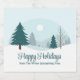 A beautiful winter landscape with teal green pine trees and snow covered ground on personalized holiday party beer bottle labels. Customize this company Happy Holidays gift for your corporate clients or employees.
