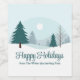 A beautiful winter landscape with teal green pine trees and snow covered ground on personalized holiday party wine labels. Customize this company Happy Holidays gift for your corporate clients or employees.