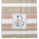 Beautiful, blue nautical shower curtain with watercolor monogram and blue-salmon pink coral pattern in a white square in the middle and tan-white stripes featuring "Hey, that`s a Stunning Beach body" custom text.