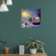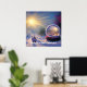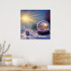 Beautiful fantasy digital art poster created using AI rendering software features a magical winter wonderland scene with a larger than life snow globe. Customizable "walking in a winter wonderland" text