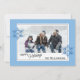 Unique, classic, trendy, pretty and decorative Holiday card. Cute Happy Holidays greeting text and room to customize or personalize with a photo, family name (or individual names) and message of your choice, framed by two blue coloured snowflakes on a classy light denim jeans blue coloured background.