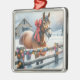Festive Christmas farm themed ornament. A pretty brown horse with a red bow on his neck standing behind an old rustic wood fence with a snowy background and vintage old red barn.