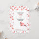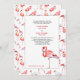 A wedding invitation, with a tropical bird theme, featuring pink flamingos.