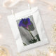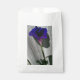 The image on the front of custom, white favour bag is a pink-purple Morning Glory wildflower protruding through a grey wooden fence, casting a shadow. The back of the bag is plain.