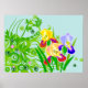 Lovely poster or print with blue background, greenery, leaves and Irises. Colorful and makes a perfect gift.