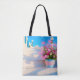 Stunning digital design of flowers on white steps with blue sky image on this tote bag. Perfect gift for birthdays, Christmas Holidays or any other occasion, most people love a practical beautiful tote bag for shopping, school, beach or other occasions. Design by Inge Lewis. Find more matching products at the ingeinc.com online store / boutique.