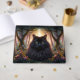 A pretty black cat watches from an enchanted forest while butterflies zoom around the hazy golden trees.