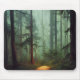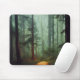 Beautiful and serene AI assisted fantasy digital art mousepad features wooden path thru misty forest trees.