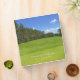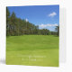Enjoying the scenery of the day on a golf course. Panoramic view of a beautiful green, tree lined, golf course with blue sky. Templates for name and subtitle.
