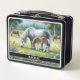 Beautiful grazing horses personalized lunch box with a different image on front and back, edit the name yourself when you order.