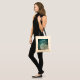 A tote bag with a photograph of a gorgeous furry fluffy grey wolf. In the background is a dark forest with trees. Magical mystical vibe.