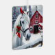 Personalized Christmas ornament. Pretty white horse with a red bow and cardinal on her head. Background has a red rustic barn with Christmas wreaths on it. A pretty watercolor scene of a snowy winter day on the farm.