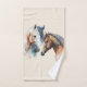 Towel set with a beautiful watercolor drawing. Featuring a pair of horses, brown and white. Head and neck visible with dripping paint along the base of their neck. Southwestern vibe.
