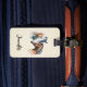 A luggage tag with a beautiful watercolor drawing. Featuring a pair of horses, brown and white. Head and neck visible with dripping paint along the base of their neck. Southwestern vibe.