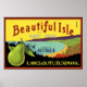 From a vintage fruit crate label from Tasmania, Australia, comes a super colourful design of a blue beach with orchards and mountains in the background an a pear in the foreground.
