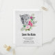 Save the date postcard with a beautiful illustration featuring a grey, black and white leopard portrait. This lovely animal is surrounded by a tropical flower bouquet. Elegant, exotic and lovely.