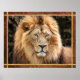 A beautiful brown lion photograph image. Face closeup. Stunning and gorgeous animal. Majestic Lion Photograph. The king of the animal kingdom! With a textured, rustic, grunge, dark brown background and gold bars framing the picture. Every element can be resized and moved around.