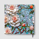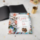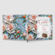 A gorgeous illustration mimicking a stained glass and tiles mosaic of coral roses and with blue and other colourful accents. This elegant wedding guestbook has a beautiful vintage aesthetic.